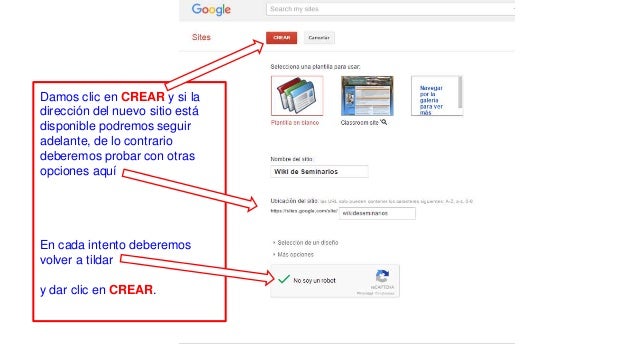 - 10. Damos clic en CREAR y si la dirección del nuevo sitio está disponible podremos seguir adelante, de lo contrario deberemos probar con otras opciones aquí En cada intento deberemos volver a tildar y dar clic en CREAR.