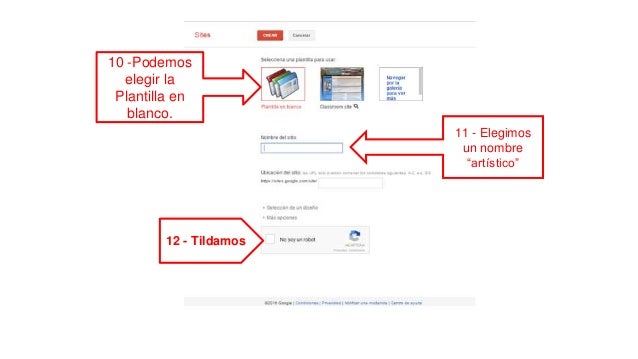 - 9. 10 -Podemos elegir la Plantilla en blanco. 11 - Elegimos un nombre “artístico” 12 - Tildamos